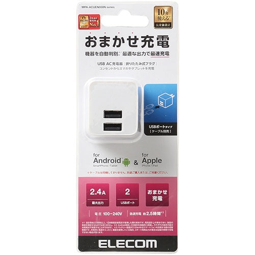 エレコム スマートフォン・タブレット用AC充電器 2ポート2.4A ホワイト MPA-ACUEN000NWH 1個