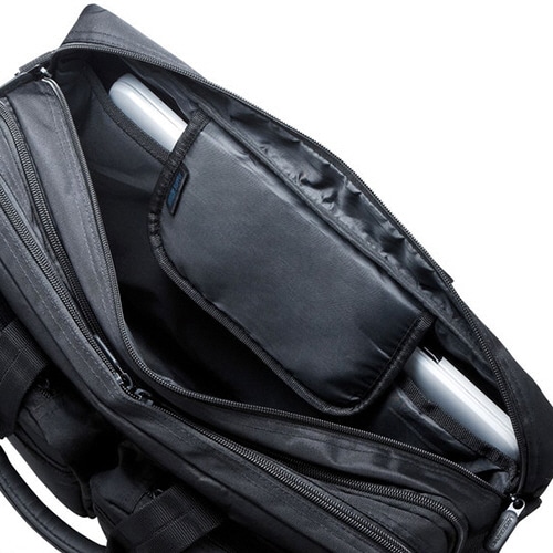 ●パソコンは厚手のクッションポケットに収納します。タブレットポケットも装備しています。