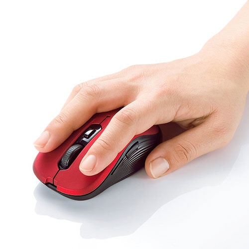 ●対称形で使いやすい、シンプルなワイヤレスマウス。本体色はレッドです。