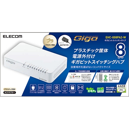 エレコム 1000BASE-T対応 スイッチングハブ 8ポート プラスチック筐体 ホワイト RoHS指令準拠(10物質) EHC-G08PA2-W 1台