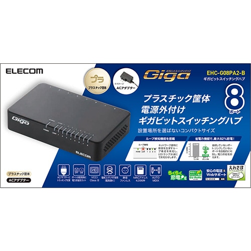 エレコム 1000BASE-T対応 スイッチングハブ 8ポート プラスチック筐体 ブラック RoHS指令準拠(10物質) EHC-G08PA2-B 1台