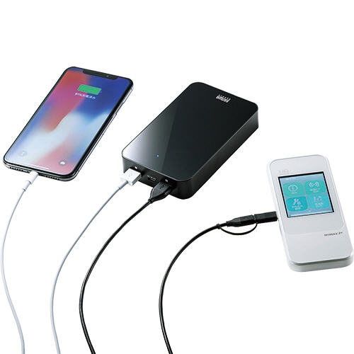●USB出力ポートを2ポート搭載しているので、2台の機器に同時充電可能です。
