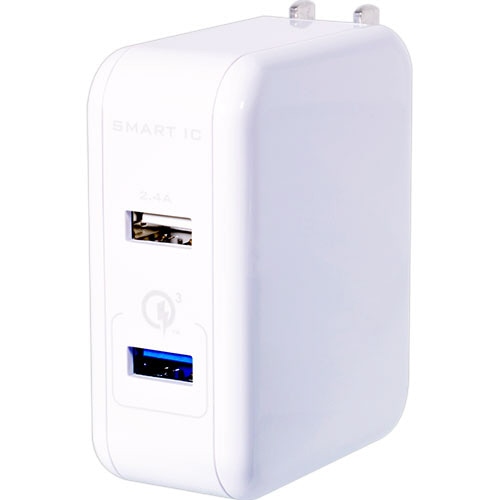 ●超速充電できるQuick Charge 3.0(QC3.0)対応のType-Aポートと、2.4A出力対応のType-Aポートを搭載したホワイトのAC充電器です。