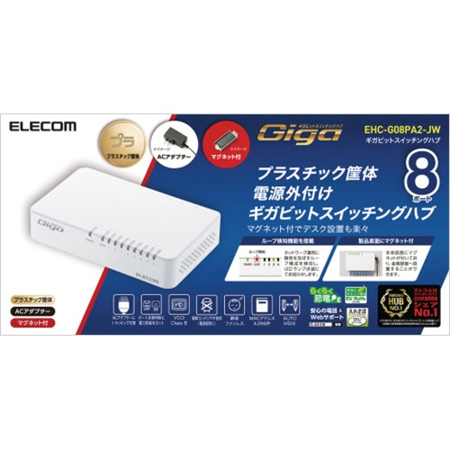 エレコム 1000BASE-T対応スイッチングハブ 8ポート プラスチック筐体 ホワイト マグネット付き RoHS指令準拠(10物質) EHC-G08PA2-J
