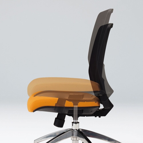 ●シンクロロッキング機能。背と座が連動して傾き、背によりかかっても座前縁部が持ち上がらず、大腿部を圧迫しないリラックス性の高い機構
