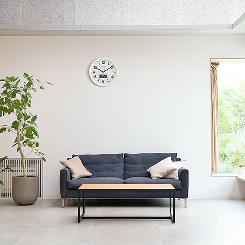 商品仕様 | ●寸法/直径300×奥行51mm ●重量/930g ●使用電池/単3アルカリ電池2本(別売) ●機能/カレンダー・温湿度表示付、ユニバーサルデザインフォント ●秒針音/なし ●材質/枠:プラスチック、風防:ガラス |