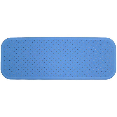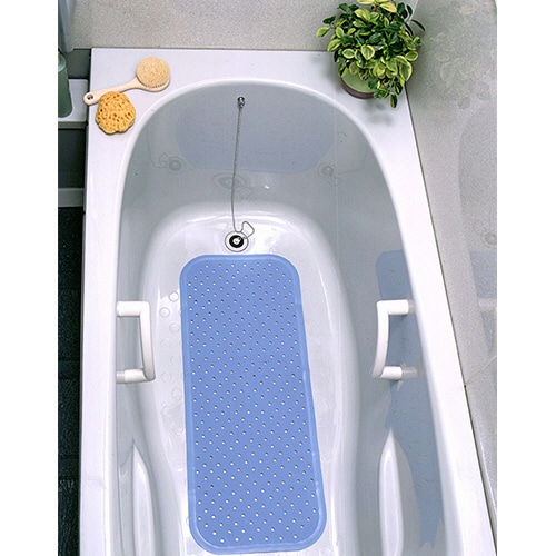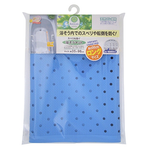 ●大型の浴そうにも対応できるロングサイズの浴そうマット、寸法約350×960mm、色はブルーです。