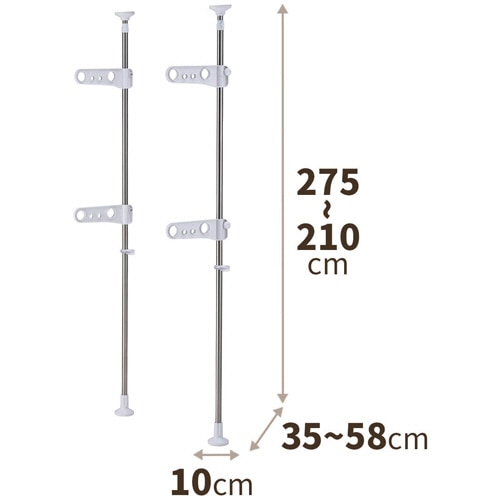 商品仕様 | ●寸法/W100×D344~580×H2075~2770mm ●材質/樹脂部分:PC・PP・ABS・EVA樹脂、パイプ:ステンレス巻きスチール、バネ・金属部品:スチール(メッキ) ●その他仕様/●ベランダ用 |
