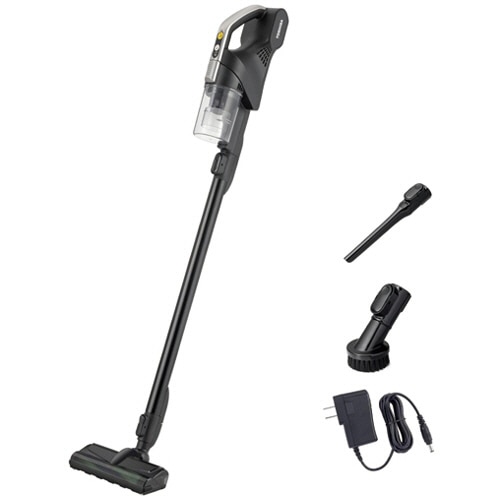商品仕様 | ●集塵容量/0.15L ●色/シャイニーシルバー ●充電時間/約4.5時間 ●稼働時間目安/強:約8分、標準:約32分 ●寸法/W230×D140×H1020mm ●重量/1.2kg ●付属品/丸ブラシ、すき間ノズル、お手入れブラシ、ACアダプター ●保証期間/1年 |