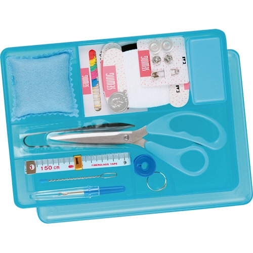 商品仕様 | ●セット内容/縫い針セット、針入れケース、ピンクッション、縫い糸(2巻)、裁ちはさみ、握りはさみ、スレーダー(糸通し)、指抜き、プラボビン、メジャー、ひも通し、リッパー(糸切)、釦2個・ホック2個・安全ピン1個セット ●寸法/W210×D155×H55mm ●重量/312g ●色/ブルー |