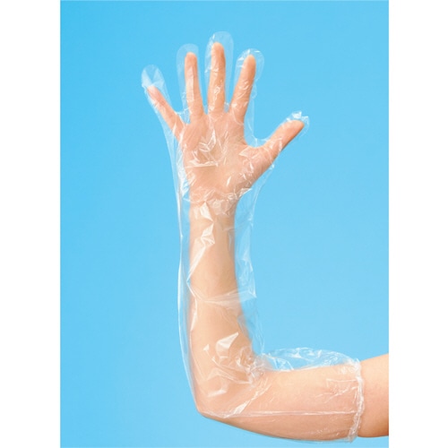 ●袖口ゴム入。半透明のポリエチレンロング手袋。50枚入です。