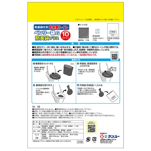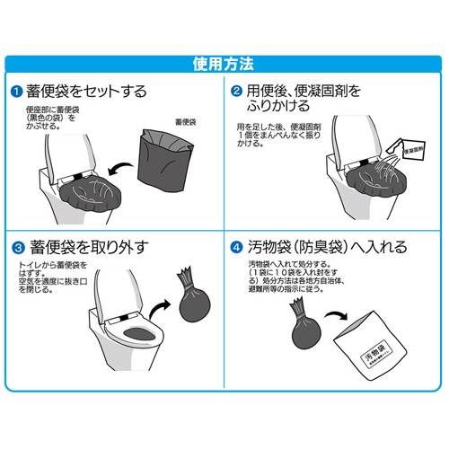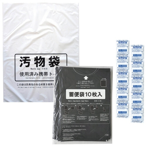商品仕様 | ●セット内容/便凝固剤(殺菌剤・消臭剤入) 10包、蓄便袋 10枚、汚物袋(防臭袋) 1枚 ●使用回数(処理目安)/10回分 ●材質/便凝固剤:高分子吸水樹脂・殺菌剤・消臭剤、蓄便袋:ポリエチレン、汚物袋:ポリエチレン・ナイロン |