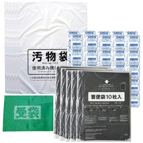 商品仕様 | ●セット内容/便凝固剤(殺菌剤・消臭剤入) 50包、蓄便袋 50枚、汚物袋(防臭袋) 5枚、受袋 1枚、使用注意ポスター 1枚 ●使用回数(処理目安)/50回分 ●材質/便凝固剤:高分子吸水樹脂・殺菌剤・消臭剤、蓄便袋・受袋:ポリエチレン、汚物袋:ポリエチレン・ナイロン |
