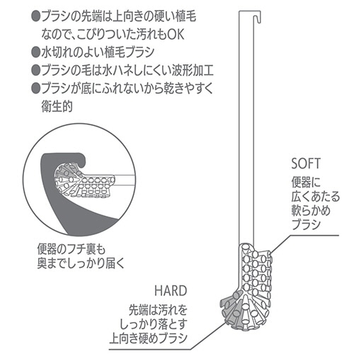 ●ブラシの先端は上向きの硬い植毛なので、フチ裏にこびりついた汚れにもしっかり届きます。ブラシの全体は便器に広くあたるやわらかめのソフトタイプでしっかり汚れをとることができます。