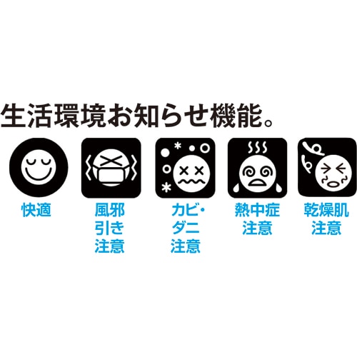 ●温度/湿度計測機能に加え、お部屋の状態をアイコンでお知らせする生活環境お知らせ機能に注意喚起機能「乾燥肌注意」が搭載。発汗の少ない秋から春にかけ、乾燥した空気にさらされることで起きる肌の乾燥注意をお知らせします。