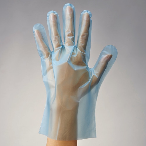 ●食品や材料に誤って混入しても、発見しやすいブルーカラー、Lサイズのポリエチレン手袋。