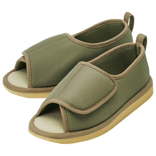 ●脱げや、わずかな段差などでの転倒を予防する室内専用シューズ。つま先なしのLLサイズ、色はうぐいすです。