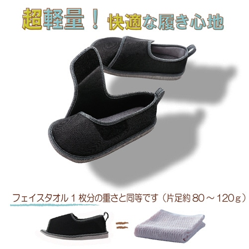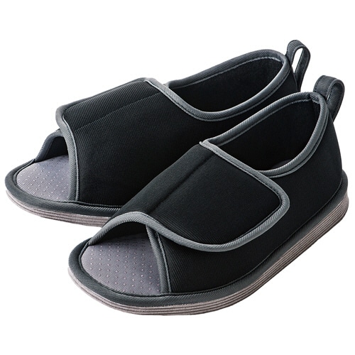 ●脱げや、わずかな段差などでの転倒を予防する室内専用シューズ。つま先なしのLLサイズ、色はブラックです。
