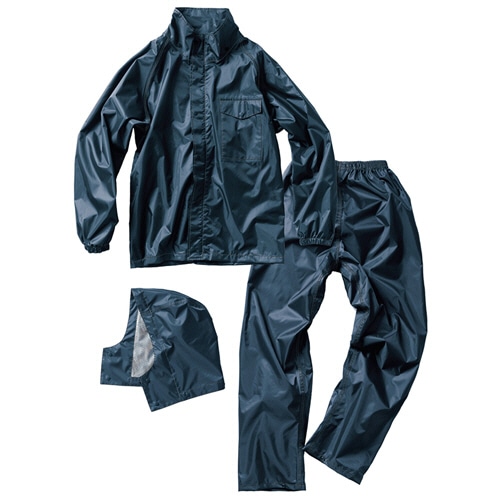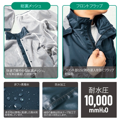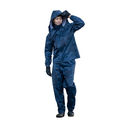 ●環境負荷低減非フッ素撥水剤を使用、耐水圧10000mmH2Oのレインスーツ。Lサイズ・ネイビーの上下セットです。