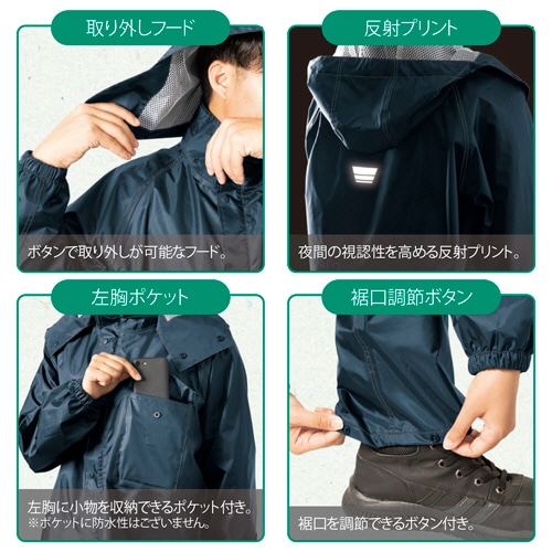 ●ジャケット:フロントフラップ付。取り外しフード。反射プリント。左胸ポケット。