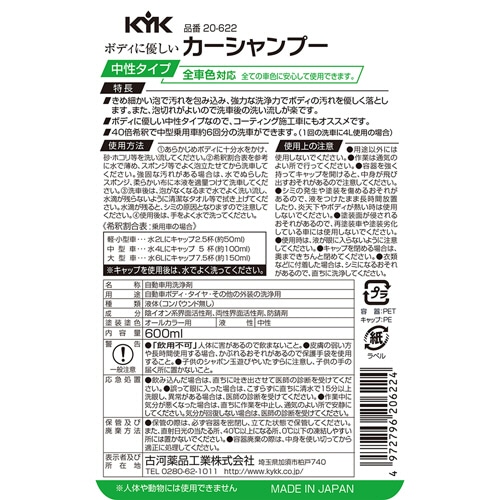 古河薬品工業 ボディに優しいカーシャンプー 中性タイプ オールカラー用 600mL 20-622 1本