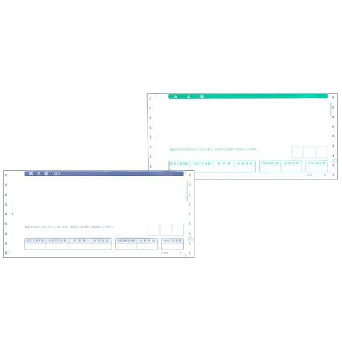 | 商品仕様 | ●様式/請求書(控)/請求書 ●寸法/10×4.5インチ ●刷色/1段目:青、2段目:緑 ●複写枚数/2枚(複写) ●複写内訳/1段目:請求書(控)、2段目:請求書、合計式 |