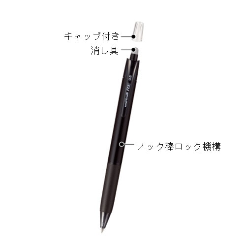 ●筆記時は一般的なノック式ボールペンと同様に、ペン先を下に向けるとスムースにノックが可能です。消去する際は軸を逆さにするだけで内蔵されている「ロック機構」が作動し、消し具を固定するのでしっかりと消すことができます。
