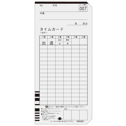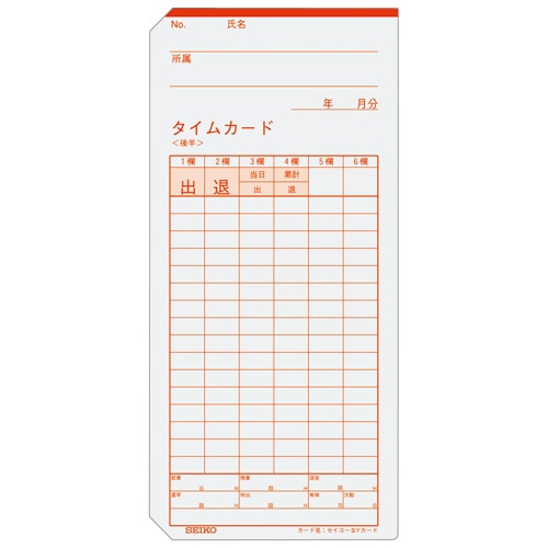 | 商品仕様 | ●対応締日/全締め日対応 ●印字面/両面6欄 ●備考/※セイコーYカード(CA-Y)の代替としても使用可能です。 |