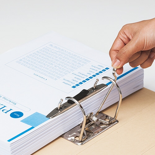 ●軽くレバーを上げるだけでとじ具が開くレバー式アーチファイルの青です。