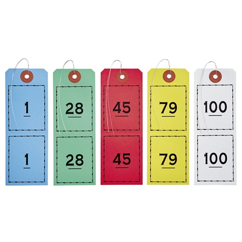 商品仕様 | ●色/青、赤、黄、緑、白 ●材質/色上質特厚 ●その他仕様/●ラベルサイズ:W47×D130mm ●センター部分に切り取り用ミシン目入 ●備考/※各色1~100番までが1組 ※センター部分に切り取り用ミシン目入り |