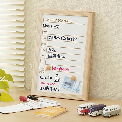 木のぬくもりがやさしい、インテリアに合うホワイトボード。