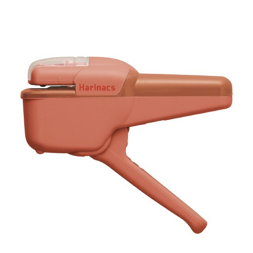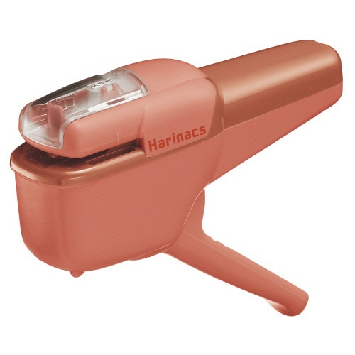 ●手に持ったまま、軽い操作でコピー用紙(PPC用紙)約10枚をとじられる針なしステープラー。色はサーモンピンクです。