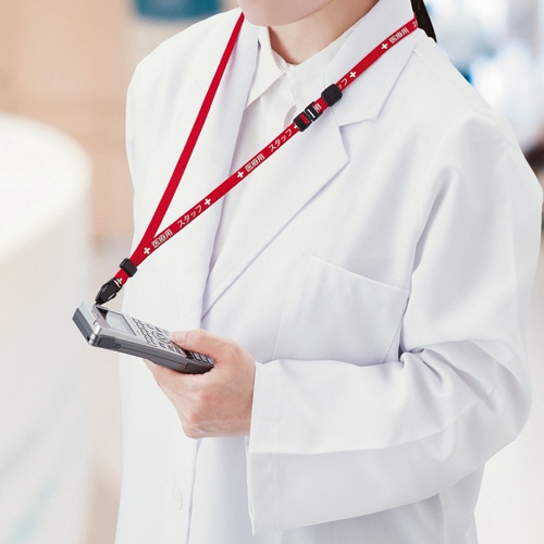 「医療用スタッフ」の文字が印字されているストラップ