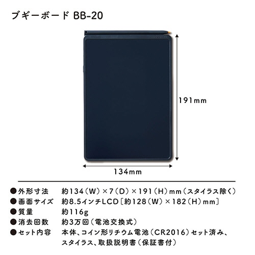 | 商品仕様 | ●寸法/W約134×D7×H191mm ●重量/116g ●色/クロ ●液晶/約8.5型LCD ●画面サイズ/約182×128mm ●電源/CR2016×1個 (動作確認用本体セット済・電池交換可能) ●その他仕様/●材質:ABS ●消去回数:約3万回 ●付属品/スタイラス、取扱説明書 ●保証期間/1年 ●備考/※電子機器における有害物質の使用を禁止したRoHS指令に対応しております。 |