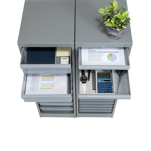 ●バイオフィリックデザインを取り入れたオフィスや、シックなオフィスにぴったり。深9段・アッシュグレーのフロアケース。