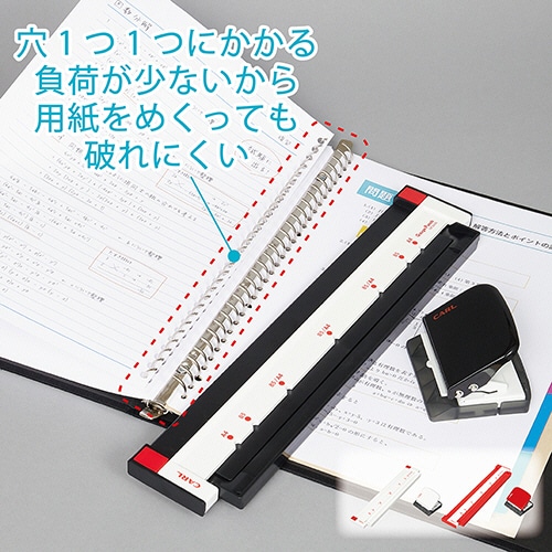 | 商品仕様 | ●色/ブラック ●穴あけ枚数/5枚 ●穴数/A4:30穴、B5:26穴 ●穴間隔/9.5mm ●穴径/5.5mm ●穴奥行/6.35mm ●対応用紙サイズ/A4、B5 ●材質/SPCC、ABS、PP ●その他仕様/●サイズ:[ゲージ]W333×D71×H13mm、[パンチ]W73×D68×H56mm ●重量:[ゲージ]122g、[パンチ]176g |