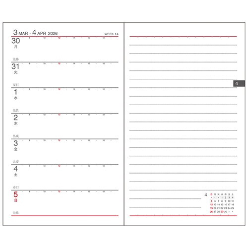 ●左半分が1週間のスケジュール、右半分が横罫のメモスペースで、1週間の予定とメモを見開きで管理できる人気のレイアウトです。