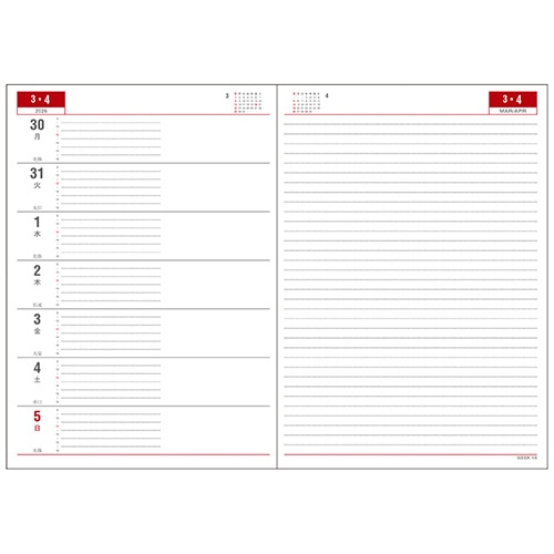 ●左半分が1週間のスケジュール、右半分が横罫のメモスペースで、1週間の予定とメモを見開きで管理できる人気のレイアウトです。
