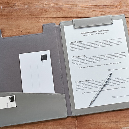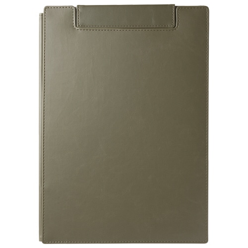 ●カバー付、オリーブのクリップボード。書類や名刺が収容できるポケット付。