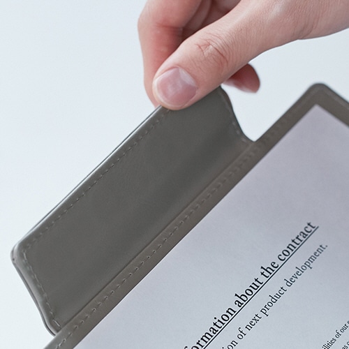 ●カバー付、キャメルのクリップボード。書類や名刺が収容できるポケット付。