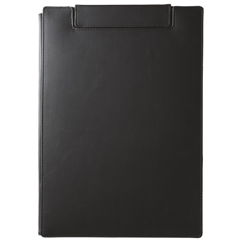●カバー付、クロのクリップボード。書類や名刺が収容できるポケット付。