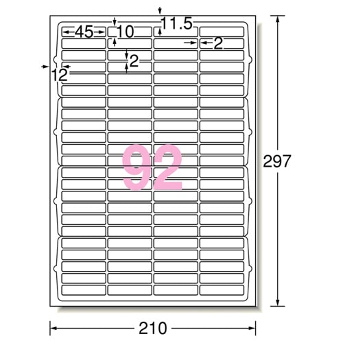 商品仕様 | ●サイズ/A4 ●シートサイズ/210×297mm ●ラベルサイズ/10×45mm ●面付け/92面 ●坪量/120g/m2 ●ラベルの厚み/0.07mm ●総厚み/0.13mm ●白色度/81% ●紙色/ホワイト ●重量/115g ●備考/※厚紙モード、手差し給紙でお使いください。 ※お使いの機種によっては対応しない場合がございます。 |