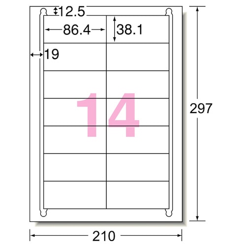 商品仕様 | ●サイズ/A4 ●シートサイズ/210×297mm ●ラベルサイズ/38.1×86.4mm ●面付け/14面 ●紙質/上質紙 ●坪量/120g/m2 ●ラベルの厚み/0.07mm ●総厚み/0.13mm ●白色度/81% ●紙色/ホワイト ●重量/780g ●備考/※厚紙モード、手差し給紙でお使いください。 ※お使いの機種によっては対応しない場合がございます。 |