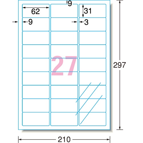 商品仕様 | ●サイズ/A4 ●シートサイズ/210×297mm ●ラベルサイズ/31×62mm ●面付け/27面 ●カット内容/四辺余白(角丸) ●紙質/ポリエステルフィルム ●総厚み/0.15mm ●紙色/透明 ●備考/※顔料インクには非対応です。 |