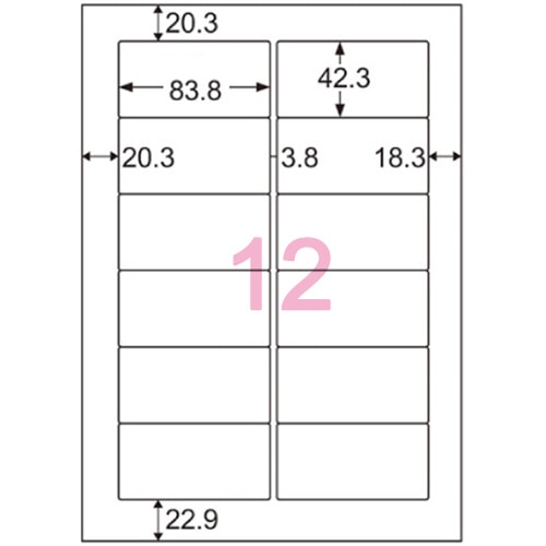 商品仕様 | ●サイズ/A4 ●シートサイズ/210×297mm ●ラベルサイズ/42.3×83.8mm ●面付け/12面 ●カット内容/四辺余白(角丸) ●総厚み/約0.15mm ●白色度/約120% ●備考/※モノクロコピー、モノクロレーザー、カラーコピー、カラーレーザーでは、厚紙モード・手差し給紙でお使いください。お使いの機種によっては対応しない場合がございます。 ※インクジェットでは、にじみが生じる場合がございます。 |
