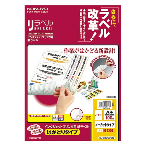 コクヨ インクジェットプリンタ用 紙ラベル(リラベル)(はかどりタイプ) A4 ノーカット KJ-E80908N 1冊(100シート)