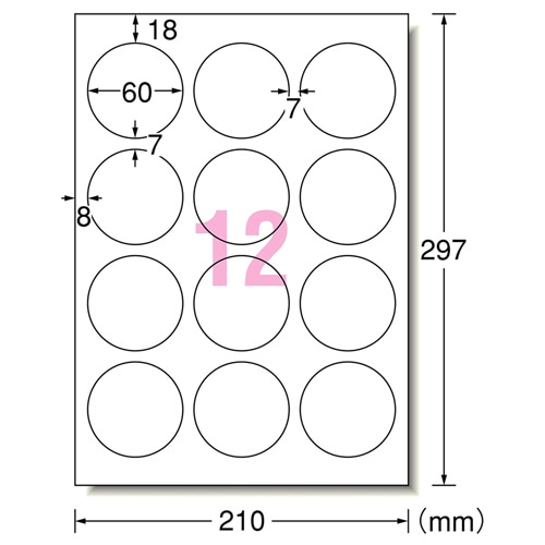 | 商品仕様 | ●サイズ/A4 ●シートサイズ/210×297mm ●ラベルサイズ/Φ60×mm ●面付け/12面 ●カット内容/丸形 ●紙質/光沢紙 ●総厚み/0.18mm ●紙色/ホワイト ●備考/※顔料インクの場合、インクの乾燥には時間がかかります。 |