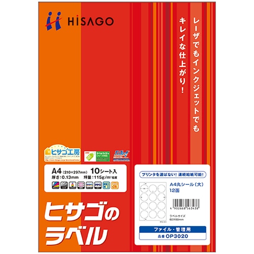 | 商品仕様 | ●サイズ/A4 ●シートサイズ/210×297mm ●ラベルサイズ/60×60mm ●面付け/12面 ●カット内容/丸シール大 ●紙質/上質紙 ●坪量/115g/m2 ●ラベルの厚み/0.07mm ●総厚み/0.13mm ●紙色/白 ●備考/※ラベルを印刷する際は「ラベル」あるいは「厚紙」設定でお使いください。給紙方法や設定等はそれぞれのプリンタマニュアルでご確認ください。 ※インクジェットプリンタで印刷の際は、普通紙設定で印刷してください。本製品には耐水性はありません。 ※剥離紙(台紙)は樹脂ラミネート加工がされていないので、そのままリサイクルが加工です。 ※メーカーホームページより印刷用ソフト「ヒサゴ工房」を無料でダウンロードできます。 |