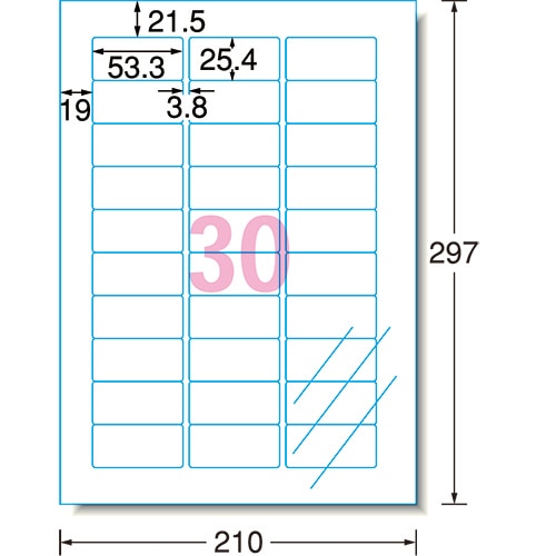 商品仕様 | ●サイズ/A4 ●シートサイズ/210×297mm ●ラベルサイズ/25.4×53.3mm ●面付け/30面 ●カット内容/四辺余白(角丸) ●紙質/ポリエステルフィルム ●総厚み/0.15mm ●紙色/透明 ●備考/※顔料インクには非対応です。 |