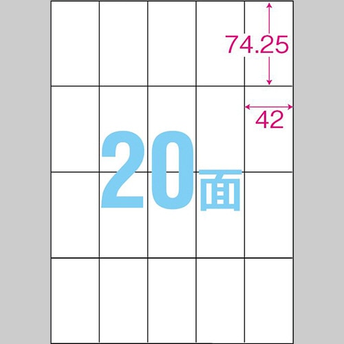 商品仕様 | ●サイズ/A4 ●シートサイズ/210×297mm ●ラベルサイズ/42×74.25mm ●面付け/20面 ●カット内容/5列×4段 ●紙質/上質紙 ●総厚み/0.14mm ●白色度/91% ●その他仕様/●対応機種:インクジェット、カラーレーザー、モノクロレーザー、モノクロコピー ●備考/※厚紙モード、手差し給紙でお使いください。 ※お使いの機種によっては対応しない場合がございます。 |